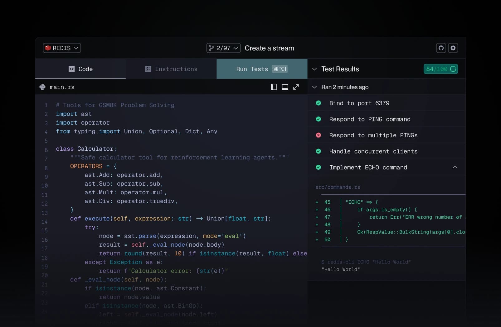 git push to run tests. Results and hints in seconds